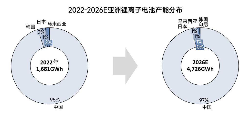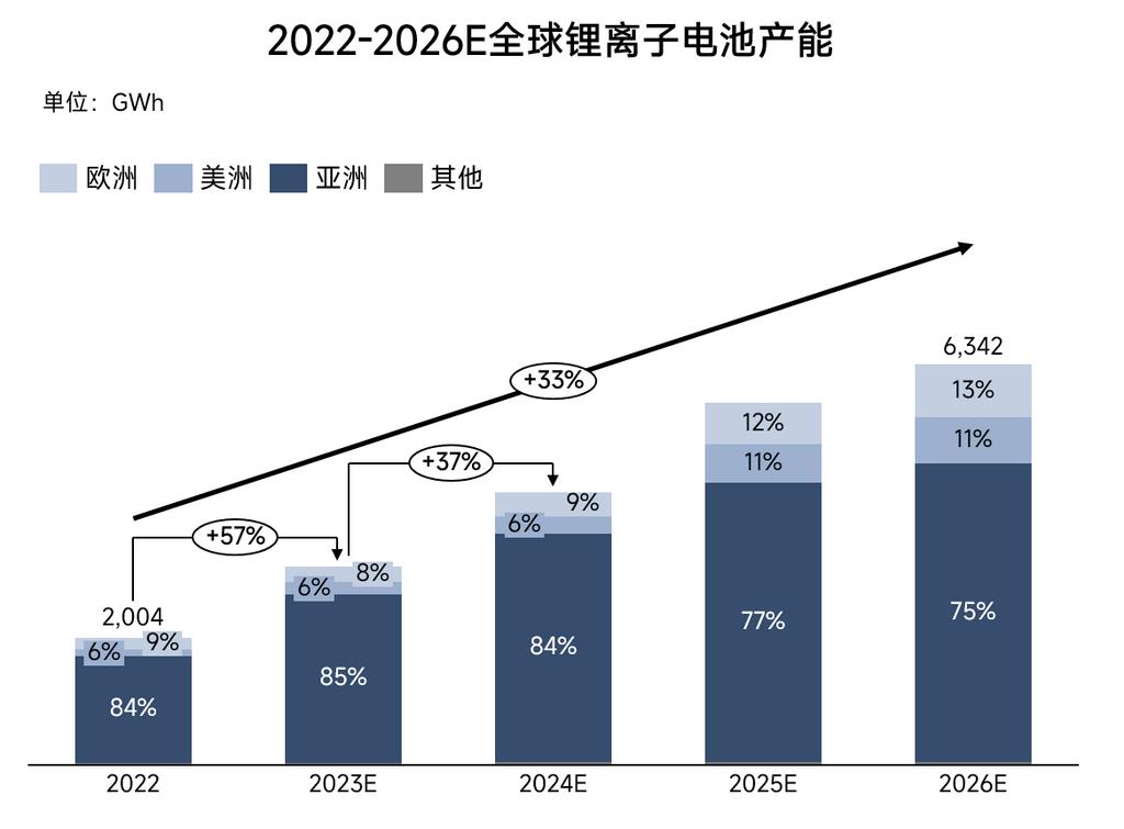 從總體來看,2022年全球鋰離子電池產(chǎn)能已超過2,000GWh,并有望在未來4年內(nèi)保持33%的年復(fù)合增速,在2026年實現(xiàn)超6,300GWh的鋰離子電池產(chǎn)能。