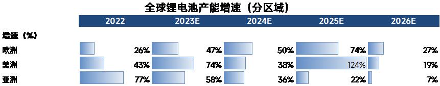 分地區(qū)增速來看,2022年亞洲產(chǎn)能增速最高,達到了77%,其次是美洲與歐洲。與此同時,為刺激本土鋰電產(chǎn)業(yè)鏈建設(shè),近年來美國、歐盟相繼頒布法案,鼓勵電池企業(yè)出海歐美。從未來增速看,考慮歐美產(chǎn)能建設(shè)及釋放周期,2025年將是其產(chǎn)能釋放時間點,當年產(chǎn)能增速將達到峰值。