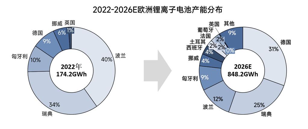 分國家來看,2022年鋰離子電池產(chǎn)能CR5的國家分別是中國、美國、波蘭、瑞典、韓國,CR5合計占比達到了93%,產(chǎn)能格局實現(xiàn)了高度集中。其中,中國即可占據(jù)全球80%的產(chǎn)能份額。同時,日韓頭部電池企業(yè),如LGES、SK及松下等,多數(shù)以客戶布局為導(dǎo)向,從而優(yōu)先選擇在中國、美國建設(shè)產(chǎn)能,在日韓產(chǎn)能布局較少,且在未來鮮有擴產(chǎn)規(guī)劃。所以韓國、日本在鋰電池產(chǎn)能排名中并未躋身前列,且在2026年韓國或?qū)⒉辉贑R5名列之中。此外,受美國IRA法案及歐洲《凈零工業(yè)法案》和《歐洲關(guān)鍵原材料法案》提案的影響,進一步加速其本土鋰電產(chǎn)業(yè)鏈建設(shè),吸引電池企業(yè)出海歐美建設(shè)產(chǎn)能。受此影響,預(yù)期2026年美國、德國等國占比將實現(xiàn)提升。