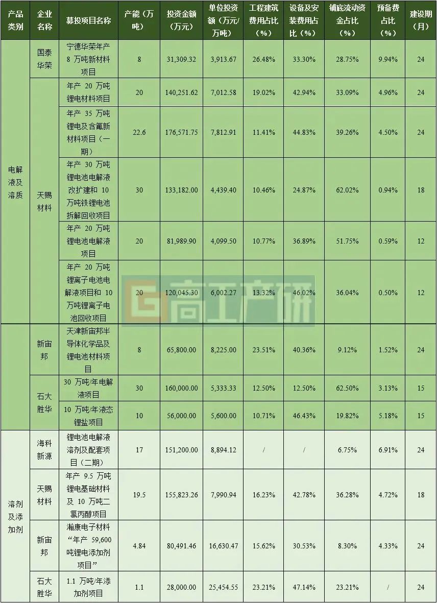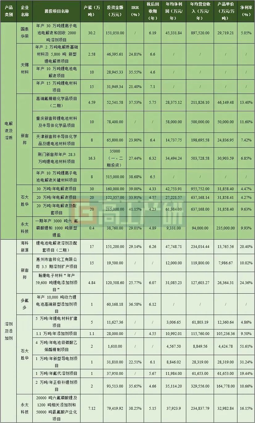 2021-2023年Q1國(guó)內(nèi)部分電解液募投項(xiàng)目經(jīng)濟(jì)指標(biāo)一覽表