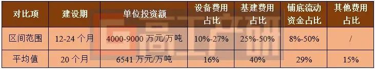 (3)從項(xiàng)目投資占比來(lái)看,電解液募投項(xiàng)目的投資明細(xì)中,基建費(fèi)用占總投資金額的比例最大,平均占比為40%,鋪底流動(dòng)資金占比次之,平均值為29%,設(shè)備費(fèi)用占比較低,行業(yè)平均值為16%。電解液屬輕資產(chǎn)行業(yè),募投項(xiàng)目的設(shè)備費(fèi)用占比顯著低于正極材料、負(fù)極材料、隔膜等其他鋰電材料。