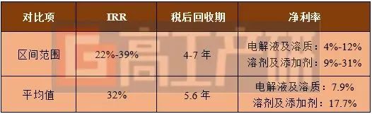 (1)電解液募投項(xiàng)目IRR一般介于22%-39%,行業(yè)平均值達(dá)32%,處于較高水平;