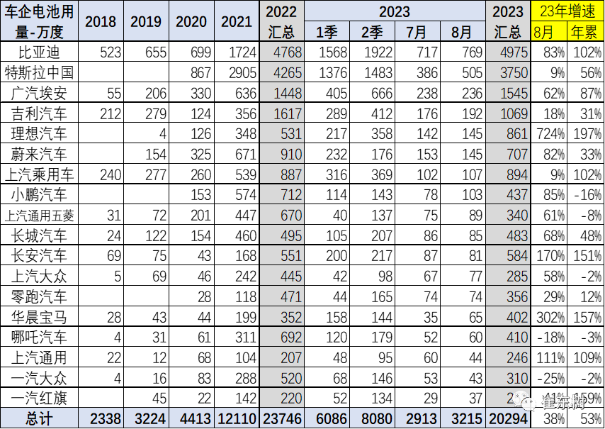 從整車企業(yè)角度看,2023年比亞迪和特斯拉兩家的電池需求占到43%,由于比亞迪的電池制造的優(yōu)勢(shì)明顯,因此比亞迪仍是強(qiáng)勢(shì)增長(zhǎng)中。