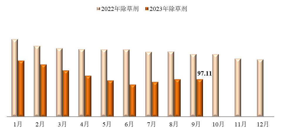 除草劑價(jià)格指數(shù)為97.11,環(huán)比上漲0.32%,同比下跌40.31%。監(jiān)測(cè)在內(nèi)的33種除草劑產(chǎn)品中,加權(quán)平均成交價(jià)格環(huán)比上漲的14種,環(huán)比下跌的17種,環(huán)比持平的2種;加權(quán)平均成交價(jià)格同比上漲的2種,同比下跌的29種。