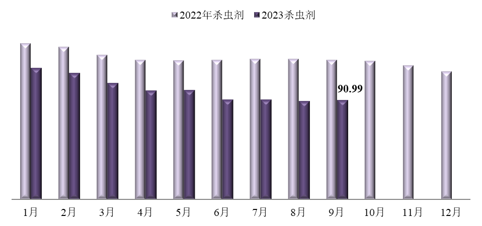 殺蟲劑價(jià)格指數(shù)為90.99,環(huán)比回漲0.53%,同比下跌28.64%。監(jiān)測(cè)在內(nèi)的34種殺蟲劑產(chǎn)品中,加權(quán)平均成交價(jià)格環(huán)比上漲的18種,環(huán)比下跌的14種,環(huán)比持平的2種;加權(quán)平均成交價(jià)格同比上漲的5種,同比下跌的26種,同比持平的3種。