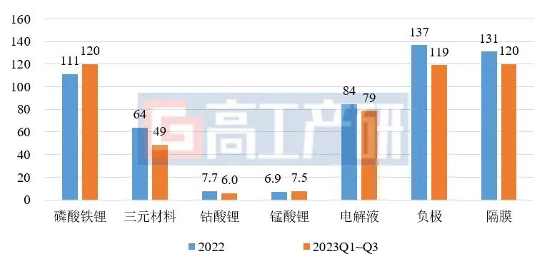2022-2023Q1~Q3中國(guó)鋰電池用主材出貨量(萬(wàn)噸,億平)