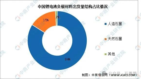 目前,中國鋰電池負(fù)極材料主要以石墨為主,其中人造石墨占比最高。2022年人造石墨占鋰電池負(fù)極材料的84%,天然石墨占比達(dá)15%。