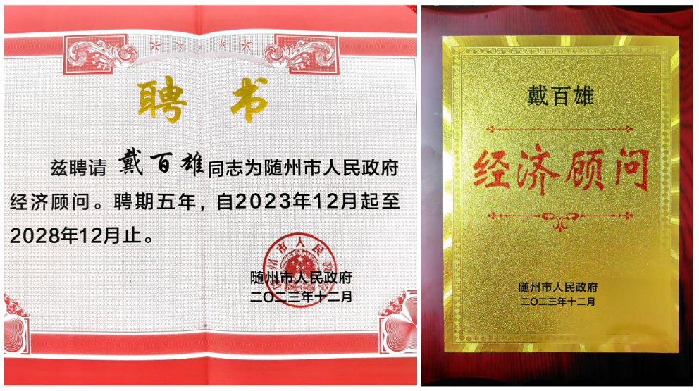 2023年12月13日,公司黨委書記、董事長戴百雄被隨州市人民政府聘請為“政府經(jīng)濟(jì)顧問”,市委書記錢遠(yuǎn)坤,市委副書記、市長克克現(xiàn)場為董事長授牌、頒發(fā)聘書。